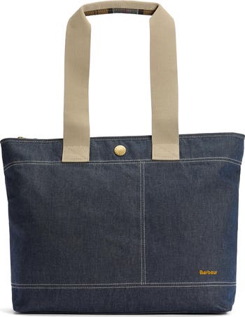 Dry waxed cotton keeps the durability up and the weight down for this spacious tote bag featuring signature Barbour detailing, such as corduroy trim and tartan lining.