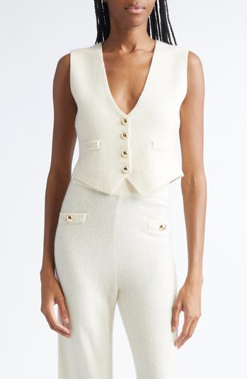 This cropped sweater-vest with gleaming golden buttons is knit from soft and luxurious cashmere yarn in a fit that resembles the tailoring of a traditional waistcoat.