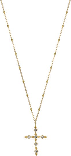 A gleaming cross pendant adorned with sparkling diamonds brings exquisite light to this handcrafted necklace made from 18-karat gold.