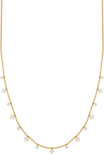 Part of our online trunk show, this style is available for a limited time From July 12 through August 3. Fiery stations of mixed-scale, prong-set diamonds light up this delicate ball-chain necklace handcrafted from 18-karat gold.