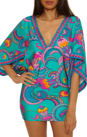 Brighten your poolside look with this boldly print cover-up featuring a v-neck and beautifully draped sleeves.