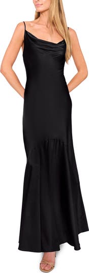 Slinky meets stunning in this chic floor-skimming dress cut from liquid satin and detailed with a drapey cowl neckline.