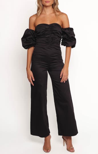 Shapely ruching at the bodice brings gorgeous texture to this shoulder-baring jumpsuit framed by voluminous puffed sleeves and perfect for your next night-out look.