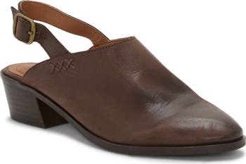 A burnished leather upper and brushed antique hardware elevate a streamlined slingback mule designed with a soft almond toe and lifted by an inverted, stacked heel.