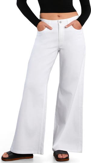 Floor-sweeping wide legs bring a stunningly chic look to these cleanly styled mid-rise jeans made with a hint of shape-retaining stretch.