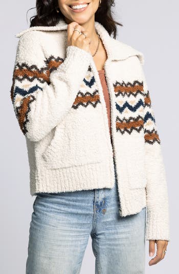 A geometric pattern furthers the cozy vibe of this ultrasoft and fluffy sweater-jacket knit in a relaxed, easy-to-layer fit and accented by handy pockets.
