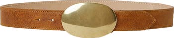 An oval plaque buckle offers polished contrast to the vintaged washed leather of this belt with a smooth nubuck lining.