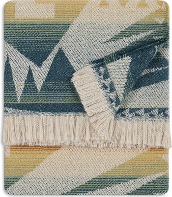 Tuck yourself in for a cozy evening under this fringed throw blanket woven in a design inspired by Mystic Lake high in Montana’s Beartooth Mountains.