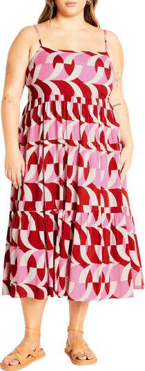 Make a mod statement in this tiered A-line dress featuring a bold geometric pattern.