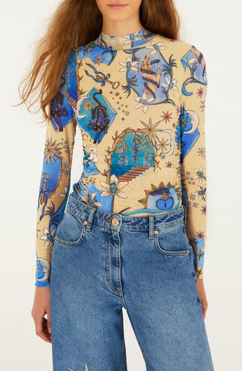 Mystical, celestial-inspired artwork brings surreal charm to this stretch-tulle top designed with a fitted silhouette and close-fitting mock neck.