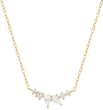 This elegant 18K gold plated sterling silver necklace features two pear-cut cubic zirconia stones alongside four round-cut accents, creating a sophisticated and timeless design. Perfect for adding a touch of sparkle to both casual and formal outfits, this piece is a stunning addition to any jewelry collection.
