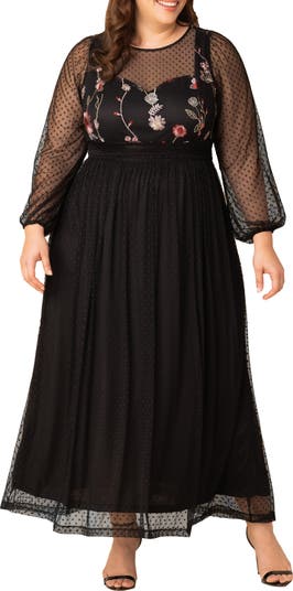 This mesh gown is a masterpiece of contrasts—delicate dotted details meet colorful embroidery in a silhouette that flows like poetry