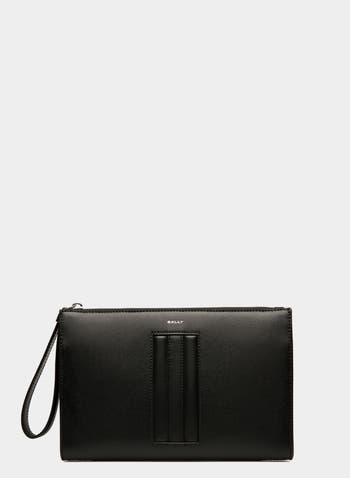 With a classic silhouette and metal hardware, the Mythos pouch is designed to organize daily essentials. A wristlet acts as the puller to the zipper along the top, in leather that matches the intarsia Bally Ribbon at the front.