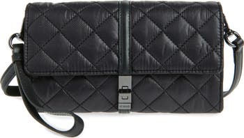 Gleaming turnlock hardware stands out at the flap of a diamond-quilted nylon bag outfitted with a divided interior and pocked-packet zip pouch for optimal organization. Removable wrist and crossbody straps are perfect for on-the-go styling.