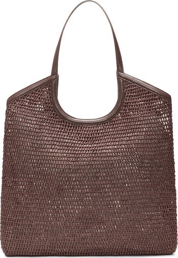 Smooth leather trim highlights the crocheted raffia exterior of a spacious tote featuring an optional zip pouch and slender pair of shoulder straps for on-the-go convenience.