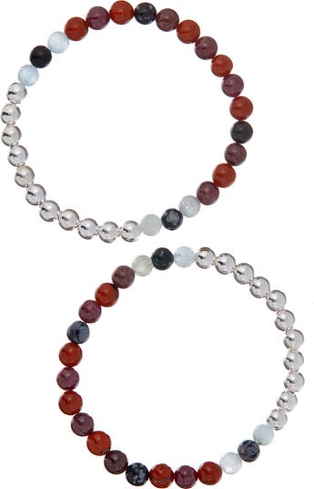 Seek balance and regulation with this pair of stretch bracelets showcasing a carefully selected mix of crystals, polished stones and silver-plated beads.