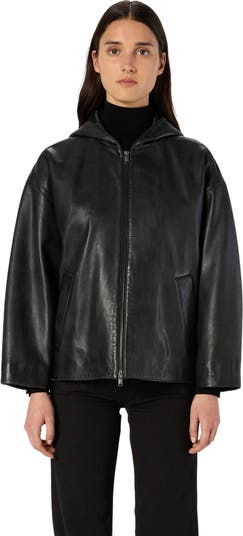 Nabila leather hooded jacket with loose fit and dropped shoulders for a contemporary look. Perfect for the start of the season, can be adapted to every mood.