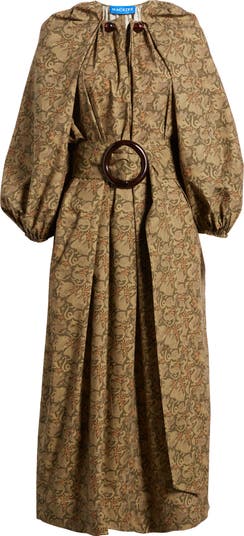 This dragon-print dress is a modern take on traditional Mediterranean silhouettes with voluminous sleeves and a slashed neck secured by a striking bauble pin. A removable tasseled belt cinches the silhouette for a more fitted look.