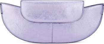 This slim crescent clutch brings a statement in a sleek package with gleaming metallic leather.