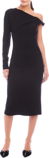 A shoulder-baring silhouette adds contemporary intrigue to a stretchy midi dress fashioned with a sleek back slit for ease of movement.