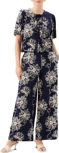 Floral embroidery makes a dreamy, dimensional statement on this woven short-sleeve shirt that ties at the front.