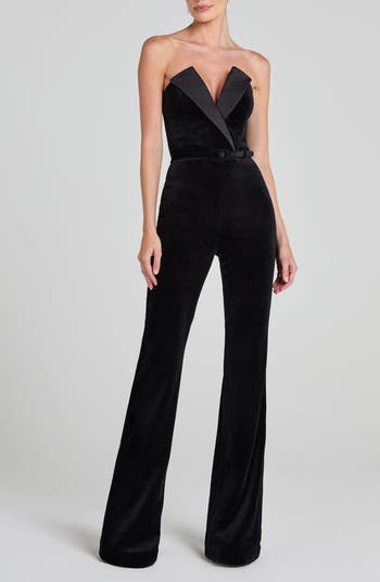 NADINE MERABI Vanessa Strapless Belted Velvet Flare Jumpsuit