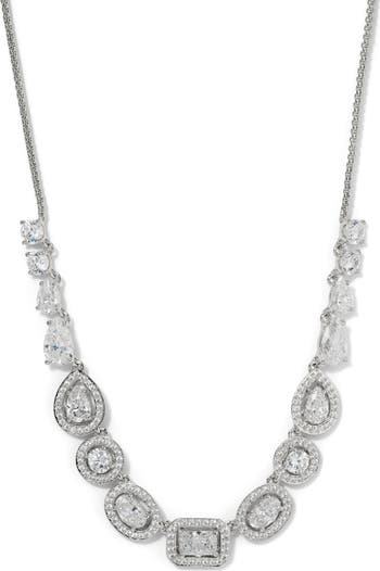 Mixed-cut zirconia with pavé halos enhance the rich sparkle this hand-polished frontal necklace that brings a glamorous glow to any evening look.