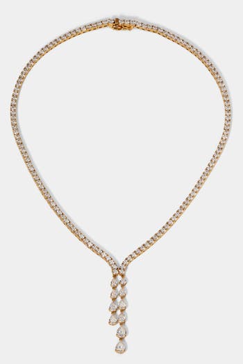 The cascading cubic zirconia stones in a y-neck silhouette create an all-around sparkle that is bound to turn heads. Perfect for adding a touch of glamour to any outfit, this necklace will make you feel like a true star.