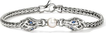 Sapphire-eyed dragons fight fiercely over a lustrous pearl on this hand-woven chain bracelet of sterling silver.