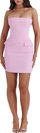 Sharply angled seams shape the boned bodice of this curvy strapless dress designed with a fold-over neckline and dyed in a pretty cotton-candy hue.