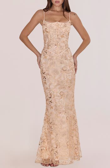 Set your style to smolder in a hand-beaded gown painted in a pretty-peach shade and designed with a corset bodice and a curve-loving mermaid silhouette. A laced-up closure at the back takes the sultry look to new heights.