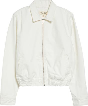 A bomber-inspired jacket is cut from creamy white denim and polished with a sharp spread collar.