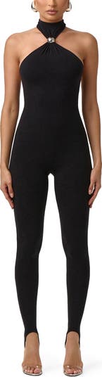 This fitted halter-neck jumpsuit with gleaming hardware at the chest is made from lightweight four-way-stretch fabric that feels ultra-soft to the touch.
