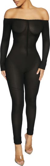 Net Off the Shoulder Long Sleeve Mesh Jumpsuit