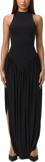 Soft, stretchy, second-skin fabric enhances the shapely silhouette of this sleeveless maxi finished with a flowy gathered skirt.