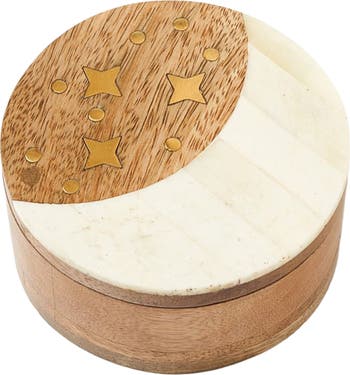 Ethically handcrafted from sustainably harvested mango wood in north central India, our enchanting Nakshatra Collection features beautiful, inlaid crescent moon and star constellation designs. This round, solid box is expertly crafted with two compartments. The lid features a crescent moon, featuring ethically sourced bone and a star constellation handcrafted from gold finish brass. This versatile box can be used for jewelry, stationary or other keepsakes. The art of traditional Indian wood craft requires mastery, passed on through generations, to create intricately hand carved treasures from solid blocks of mango wood.