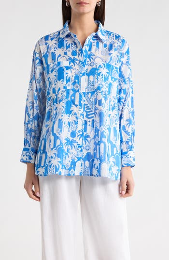 A scenic, summery print covers this lightweight button-up shirt cut in a relaxed fit that makes it perfect for wearing solo or layering into your look.