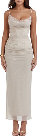 A dainty cowl neck tops this mesh dress with signature corsetry and a built-in underwire bra for lots of support.