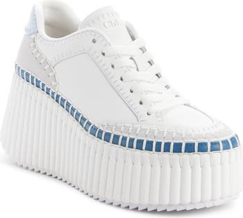 Signature hand-stitched blanket-stitch accents detail the chunky, ridged platform and layered panels of leather and suede of this sporty sneaker.