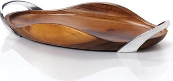 Beautifully grained acacia wood is planed to form soft, organic curves on a versatile serving tray accented with polished alloy handles.