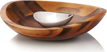 A polished serving dish stands out against the smooth acacia wood of an elegantly curved, handcrafted serving platter.
