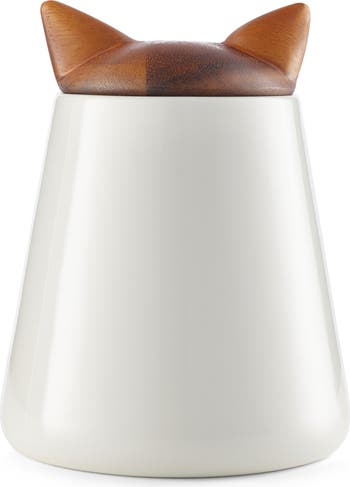 Your fancy feline will know just where her treats are stashed when you use this elegant porcelain jar with a wood lid carved to look like cute cat ears.