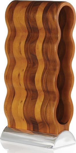 Rich acacia wood enhances the sculptural beauty of a gracefully curved wine rack set on a polished alloy base.