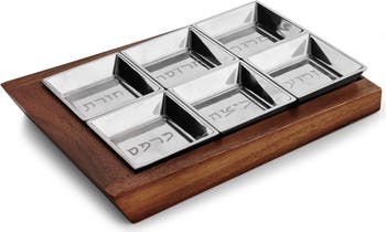 Merge tradition and modernity with a geo-inspired Seder plate featuring a rich acacia-wood base and clean, angular lines. Six shining Nambé-alloy inserts are inscribed, in Hebrew and English, with the names of the ceremonial Seder foods.