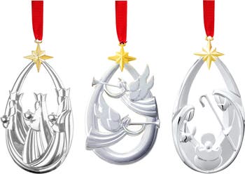 Celebrate Christmas with this trio of silvertone ornaments with golden accents that depict the Nativity scene.