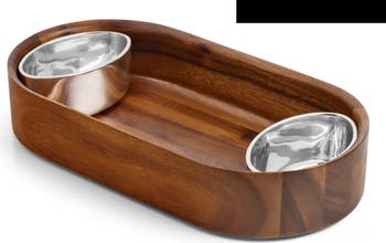 The polish of Nambè's iconic alloy and the warmth of acacia wood perfectly embody the mid-Century modern inspiration of this chip and dip set.