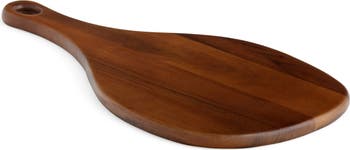 Crafted from rich acacia wood and designed with clean, fluid lines, this cutting board features an extended handle for easy serving and transporting.