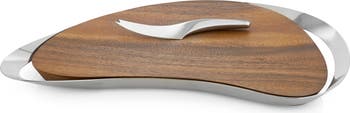 A handsome acacia-wood cheese board perfect for parties and handy for homey spreads features stainless steel accents and a sleek cheese knife.