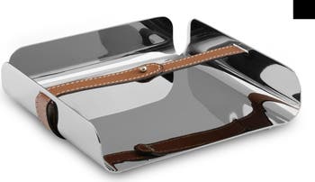 A blend of high-shine stainless steel and rich brown leather mark the strikingly refined design of this entertaining-essential napkin holder.