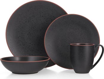 A lightly speckled finish and contrasting topline trim add contemporary elegance to a streamlined stoneware place setting that will modernize your tablescape.